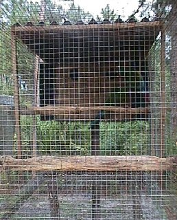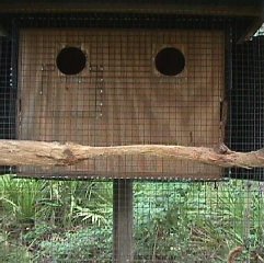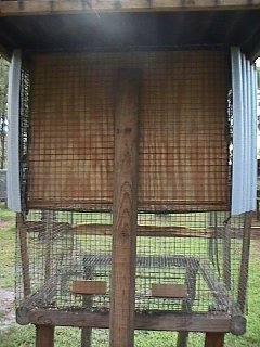 Free standing macaw cage from rear. Side panels protect the nest boxes from blowing rain and excessive exposure to the sun.