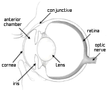 The eye is a very delicate, yet surprisingly durable organ. It consists of several layers. The cornea is a transparent layer that covers the front of the eye. The iris is the colored part of the eye and it is responsible for letting in more or less light. The lens gathers and 'bends' light in order to focus it on the retina. In between the cornea and lens is an area of fluid which bathes the lens and helps it focus. The retina lines the inside of the eye and converts light into signals which travel down the optic nerve to the brain. A large area between the lens and the retina contains a jelly-like fluid called 'vitreous.' The vitreous gives the eye its form and shape, provides nutrients, and removes waste products.