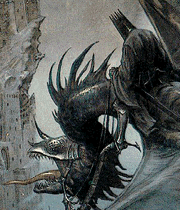 NazgûlNazgûl (Úlairi) are the nine ringwraiths controlled by Sauron. "Nine for mortal men doomed to die" is an extract from LotR that referrs to the ringwraiths who could not control the power given to them. They are Sauron´s slaves doomed to to run his errands for all eternity. They can only be wounded with weapons blessed with elvish magic, ordinary weapons can not hurt them. The first nazgûl is the Witch-king and the second is Khamûl the easterling; the rest are unknown, although it is known that at least three of the nine nazgûl were black númenóreans. Nazg means ring and gûl means wraith.
