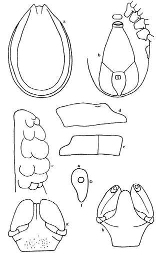 | I. holocyclus male- a, body (dorsal view); b, body (ventral view); c, capitulum (dorsal view); d, capitulum (ventral view); e, hypostome; f, tarsus I; g, tarsus IV; h, spiracular plate | I. cornuatus, male: a, body (dorsal view); b, body (ventral view); c, hypostome; d, tarsus I; e, tarsus IV; f, spiracular plate; g, capitulum (ventral view). |