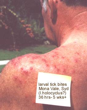 An apparently severe, delayed and long lasting reaction to larval tick bites. At times individual lesions would swell, become itchy and then subside again despite treatment with antihistamines and topical corticosteroid. (source: Paul Ambrose via email, Qld, May 2000)