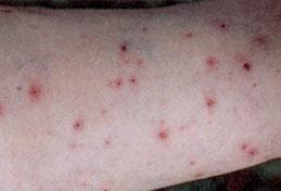 Attachment of a few larvae to a non-sensitised host provokes little or no response, even though the contact is prolonged over several days. However, towards the end of feeding some pruritus, erythema and localised odema may develop at the site of attachment. Repeated infestation with the larva, as occurs in rural and wooded suburban areas where bandicoots are common, rapidly leads to the development of hypersenstivity. Then attachment of the larvae leads to formation of intra-epidermal blebs and eventually vesicles. Finally these rupture and the larvae detach and are lost. In experimental work with the cattle tick Boophilus microplus, this occurred within 6 hours. When, as is often the case, large numbers of larvae are involved, severe allergic dermatitis may result. The maddening rash that results is commonly referred to as scrub-itch. See picture below.Outbreaks are seasonal in southeast Queensland and occur most commonly during January, February and March when larval populations are at their peak. Dermatitis is most commonly encountered in rural workers but may also result from gardening (Moorhouse, 1981). During damp summers any disturbance of taller plants - e.g. clearing lantana, can produce a shower of tick larvae.