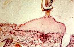 A case of human "scrub itch". The leg of a 60 year old from Mt Tamborine, who had been bitten by multiple larval ticks of Ixodes holocyclus (Moorhouse, 1981). If you have IE 5.0+ right click on image and select the zoom in option for a closer view. Vesicle ("blister") formation in the superficial skin layers as seen in the "scrub-itch" induced by tick larvae. The tip of the hypostome is in the upper part of the section. Microscopic view (Moorhouse, 1981).